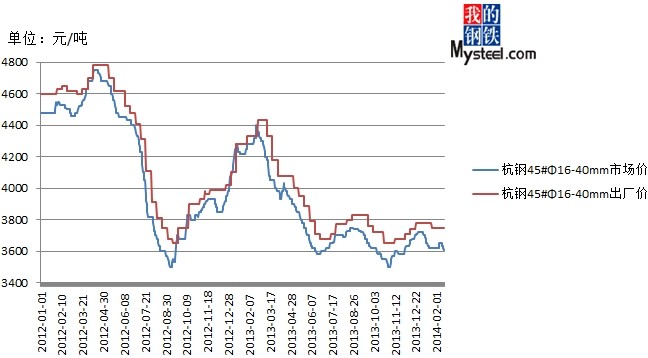 圖1:杭鋼45#Φ16-40mm出廠價、市場價走勢比對